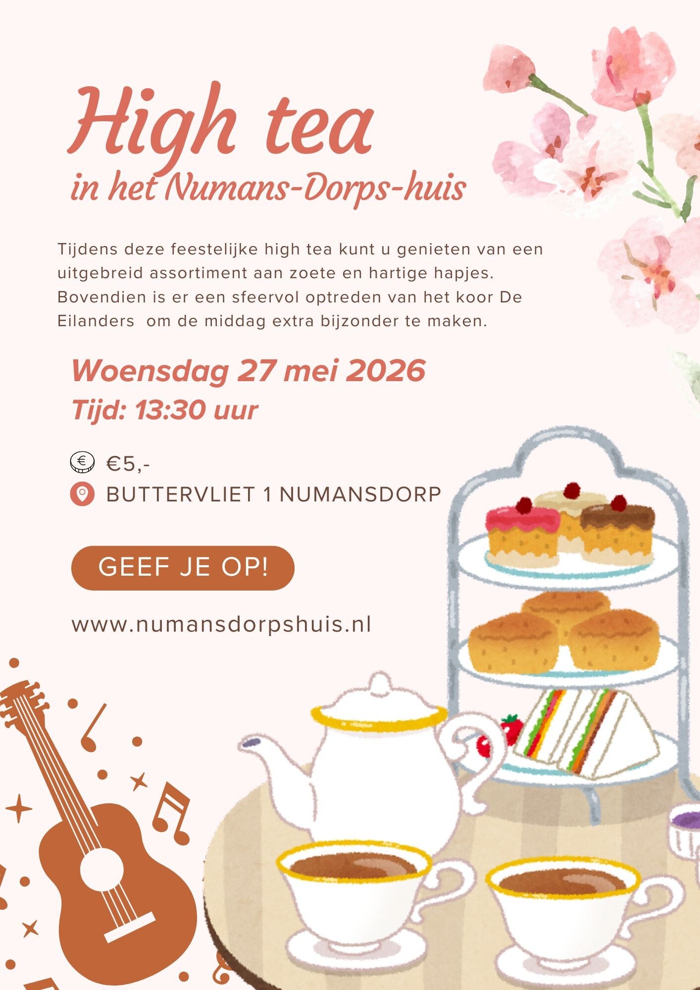Woensdag 27 mei 2026 | 13:30 uur organiseert het Numansdorpshuis voor de “oudere” bewoner van Numansdorp een gezellige high tea. Wij nodigen u van harte uit voor een gezellige middag vol lekkernijen, warme thee (of koffie) en goed gezelschap!